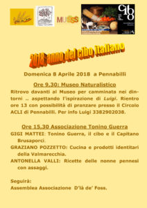 - ore 15,30 all’Associazione Tonino Guerra di Pennabilli: Incontro discussione per celebrare il 2018 “Anno del cibo italiano – Prof. GIGI MATTEI ci intratterrà su “Tonino Guerra, il cibo e il caitano Brusaorci”; – L’enogastronomo GRAZIANO POZZETTO interloquirà su “Cucina e prodotti identitari della Valmarecchia”; – ANTONELLA VALLI ci intratterrà recitandoci le “Ricette delle nonne pennesi”; al termine assaggio di alcuni cibi locali;