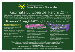 Domenica 28/05/2017 si celebra la Giornata Europea dei Parchi con diverse proposte di escursione nei territori del Parco Sasso Simone e Simoncello, come proposto nella locandina del Parco. La nostra associazione, vista la concomitanza della giornata con la Festa del fungo prugnolo a Miratoio, organizza una lunga camminata sulla testa del monte che ripercorre i sentieri proposti dal Parco nella locandina per i più esperti, ma che sfrutta la possibilità poi di raggiungere la località di Miratoio dove si svolge la festa del prugnolo. Un lungo viaggio nel Parco dunque con partenza alle ore 09:00 da San Lorenzo di Pennabilli salendo alla Testa del Monte fino all’Eremo della Madona del Faggio dove si terrà il pranzo organizzato dal Parco Sasso Simone e Simoncello a costo di € 0,00. Poi nel pomeriggio, ripresa del cammino fino a raggiungere la località di Miratoio in festa per la sagra del prugnolo. Una lunga camminata per prati e foreste con un rientro da Miratoio non a piedi.