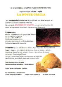 Lo spaccio di Miniera di Perticara con l’Associazione Minatori di Perticara organizzano una camminata in notturna denominata “La notte gialla”. Camminando sulle orme dei minatori alla luce delle lampade di acetilene un tempo utilizzate in miniera, verranno ripercorsi i sentieri dei minatori ammirando il tramonto sugli Appennini. Il ritrovo è previsto allo spaccio di Miniera di Perticara alle ore 17,30, seguito da un’aperigrigliata alle 18,00 con la partenza prevista per le otre 19,00. Il rientro è previsto per le ore 22,30 circa con assaggio di dolci tipici e di buon vino. Per info Cell:339 7784852 – Cell: 335 6342774 – Cell: 331 9130789.